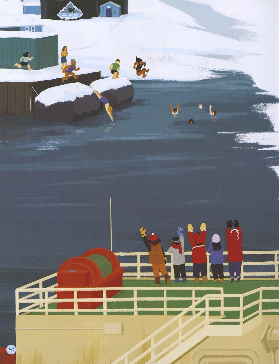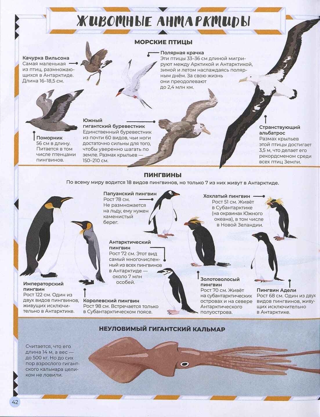 Художница Анджела Се помогает ей в этом реалистичными иллюстрациями. Она с большим мастерством и любовью изображает антарктические пейзажи, «портреты» представителей фауны: тюленей (среди которых морской леопард и морской слон), китов (от синего кита-гиганта до малого полосатика и «кита-убийцы» косатки), симпатичных «водяных мишек»–тихоходок (малюсенькие беспозвоночные), гигантских кальмаров, осьминогов, медуз, альбатросов, буревестников и, конечно, пингвинов. На страницах книги представлены семь видов пингвинов, обитающих в Антарктиде: от самого большого императорского до «малышей» — папуанского и золотоволосого (у него на голове хохолок, придающий пингвину сходство с растрёпанной девчушкой).