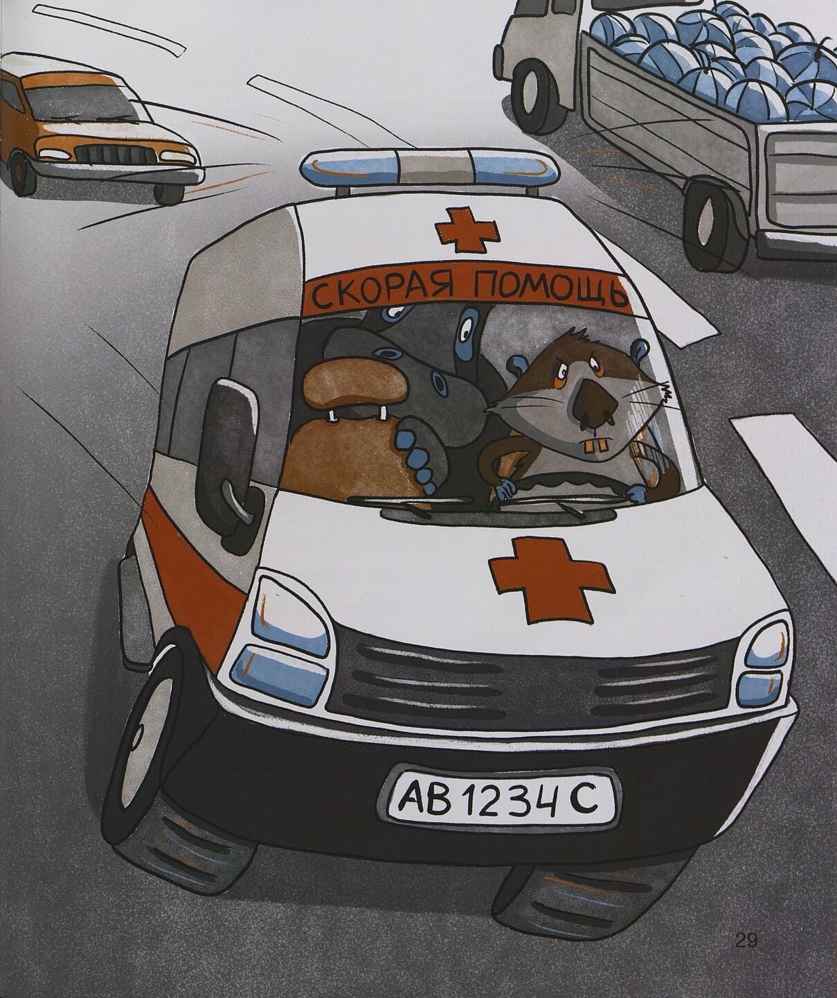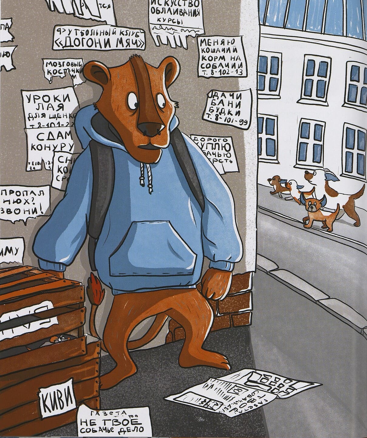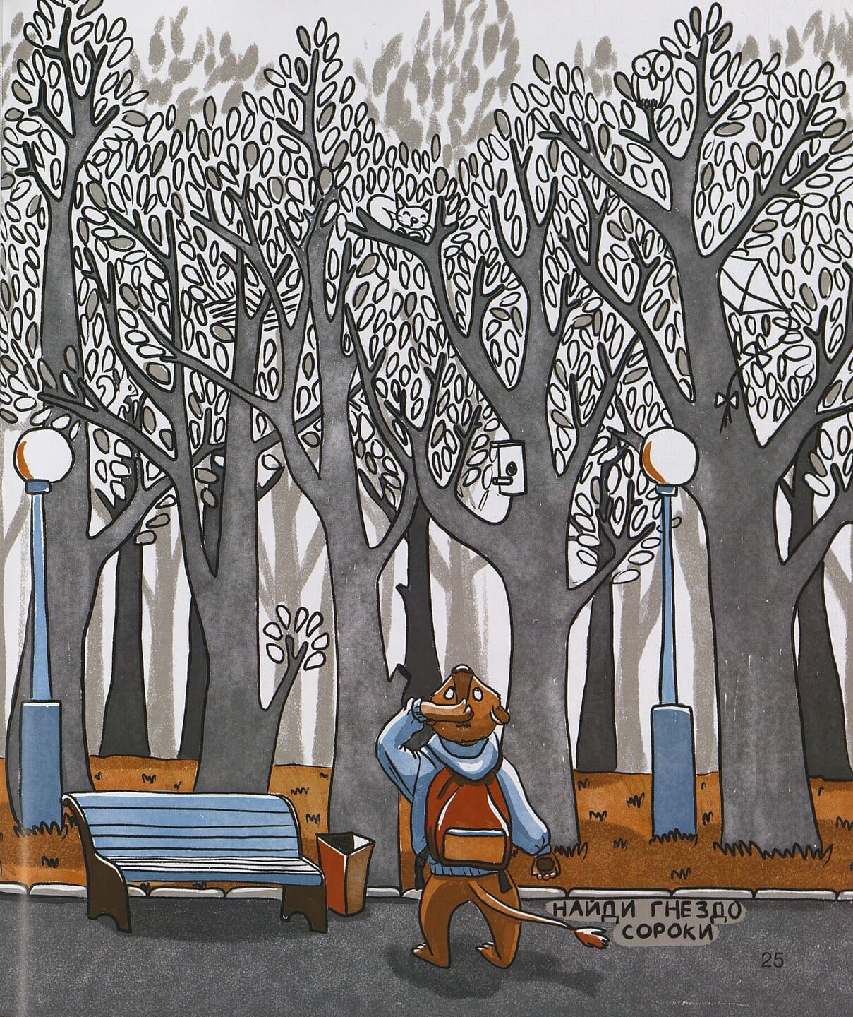 Наш новоиспеченный сыщик начал со списка «Непочётных граждан города». Вооружившись этим списком и надев худи с капюшоном, чтобы прикрыть полысевшую голову, он отправился раскрывать преступление. Среди подозреваемых оказались Петух, Мышь, Слон, Кот, Сорока, Бегемот, Заяц, Лиса и Лось. Мэр посетил и опросил каждого. Анализируя факты, он постепенно отсеивал подозреваемых. У Петуха было алиби – он всю ночь промаялся с больным горлом, что подтвердила Курица. У Мыши, как выяснилось, страшная аллергия на всех кошачьих, и, если бы она оказалась в доме Льва, ее громкое чиханье он бы услышал даже во сне. Слону его великанские размеры помешали бы проникнуть в спальню мэра. А Кот, как истинный мужчина и боец, гривам, которые мешают драться, предпочитал шрамы. Сорока известна своим пристрастием к чужим вещам, прежде всего, блестящим. Но гриву она могла украсть для того, чтобы утеплить свое гнездо. Логика погнала мэра на высокий тополь, где жила воровка. (Кстати, маленький читатель может помочь отыскать ее гнездо на рисунке.) Услыхав обвинения в краже шерсти, Сорока в возмущении так клюнула мэра, что тот свалился с дерева и угодил на носилки «скорой помощи», врачом которой оказался один из подозреваемых – Бегемот.