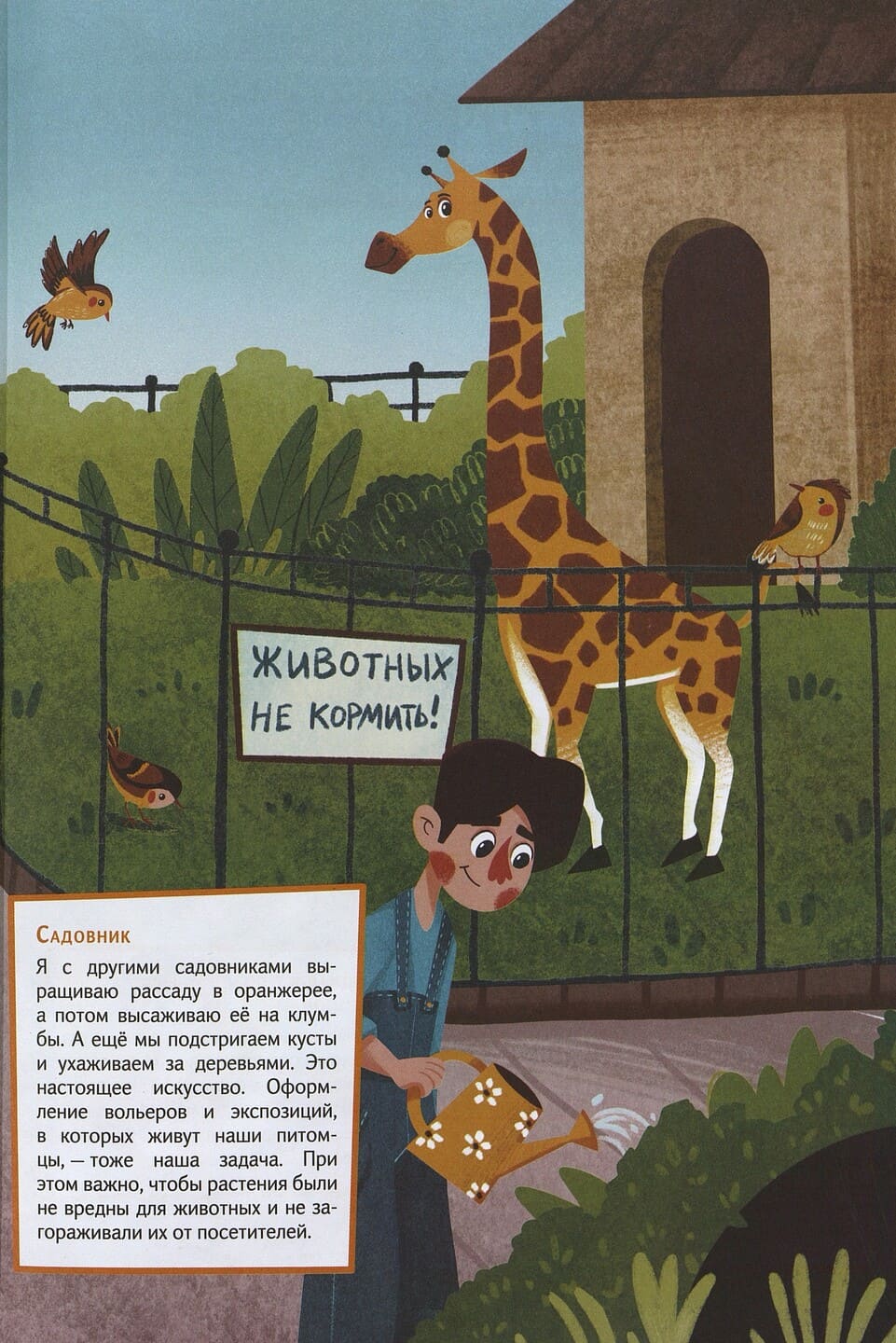 Прогулка по зоопарку начинается с покупки билета у кассира, который ответит на все вопросы о зоопарке, а контролёр подскажет, где найти интересующее гостя животное. Дворник ухаживает за территорией, ландшафтный дизайнер и садовник высаживают цветы, оформляют вольеры, подстригают кусты и деревья, чтобы растения не загораживали животных от гостей. О том, чтобы вовремя, вкусно и правильно кормить животных, заботится сотрудник кормокухни, который готовит корма и распределяет их по секциям. Специалист по кормлению знает, какие питательные вещества и в каком количестве и соотношении должен получать каждый питомец. Это определяют по книге рационов и международной базе данных. Грузчик привозит корма и развозит их по секциям. Он – самый сильный человек в зоопарке. Работник подсобного хозяйства прямо в зоопарке выращивает корма – яйца от своих курочек, мышек для орлов, насекомых для обезьян, заготавливает сено и сухие ветки ивы.