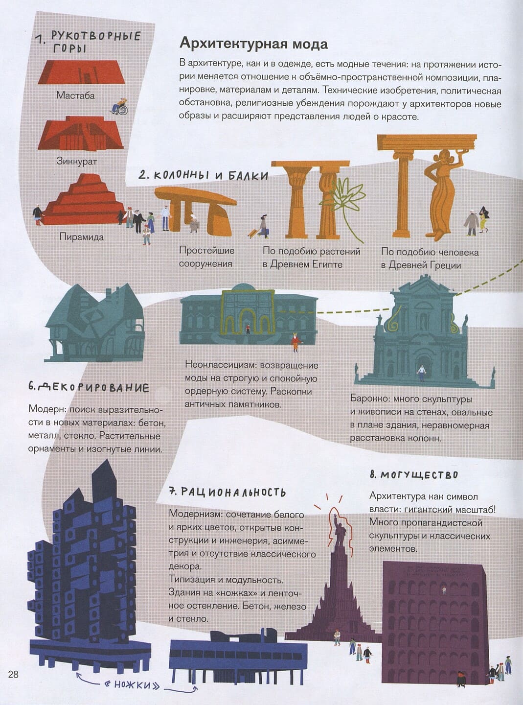 У архитектуры своя история. Чтобы познакомить с ней своих читателей, автор предлагает отправиться на миллионы лет назад. Какими были жилища у наших предков? Шалаши из глины, дерева, шкур животных. Каждый был сам себе архитектором. С развитием культуры люди уделяли всё больше внимания символам. Гробницы и храмы становились большими, их украшали скульптурами и рисунками. Появилась необходимость в планировании. От народной архитектура пришла к профессиональной. Первый известный нам архитектор, Имхотеп, был древнеегипетским мудрецом, астрологом, правой рукой фараона Джосера, для которого построил гробницу. Архитекторы Древней Греции и Древнего Рима возводили здания и конструировали военную технику, придумывали проекты, делали расчёты, руководили стройкой. В эпоху Возрождения архитекторы научились разделять свои обязанности и некоторые передавали другим специалистам.
