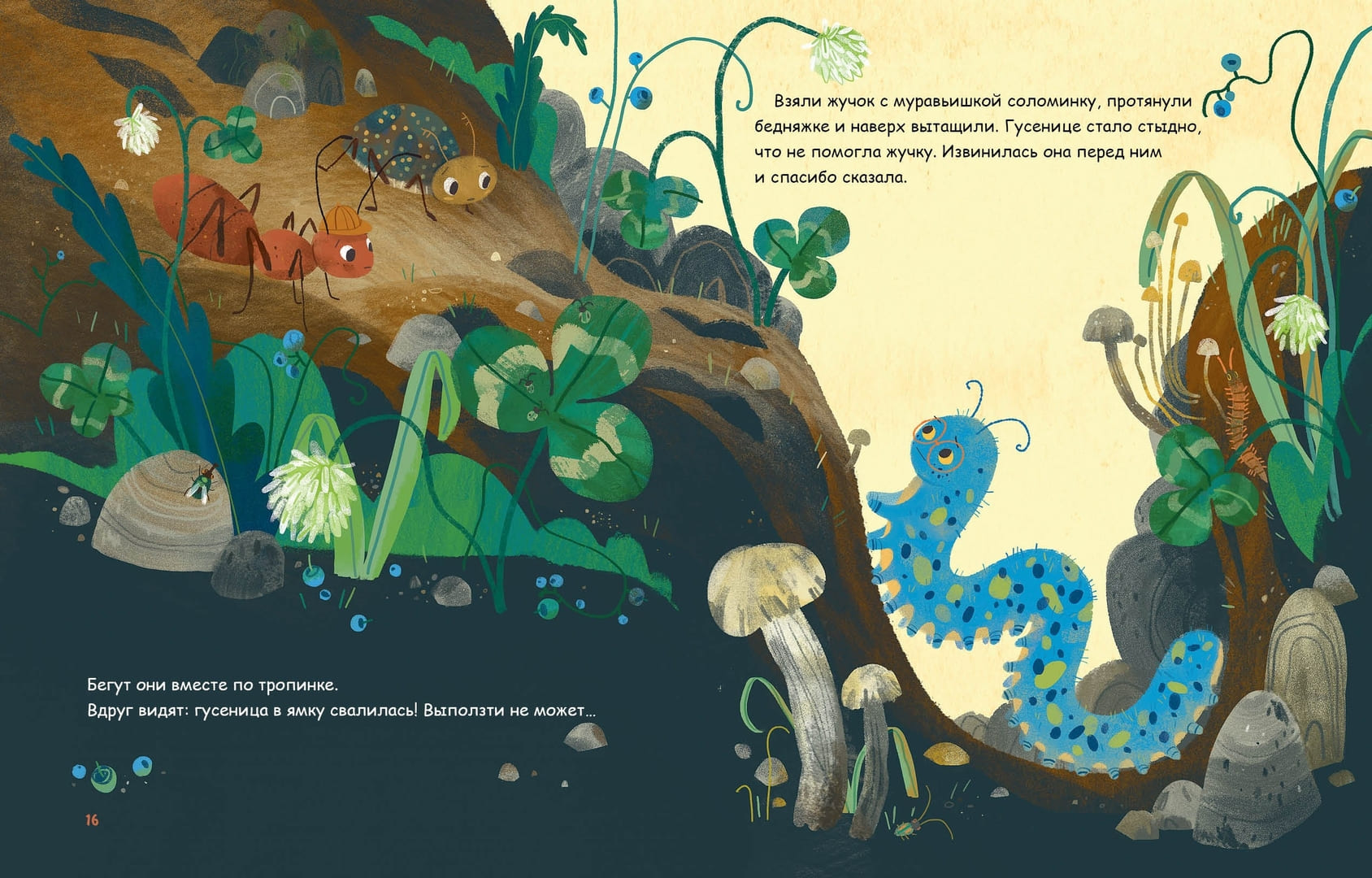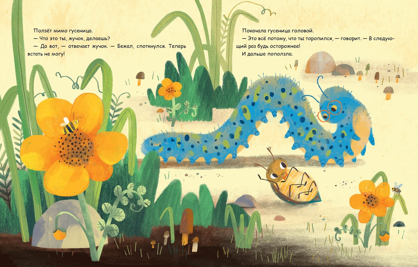 В центре повествования — маленький жучок. Он спешит по лесной тропинке, но неловко спотыкается о камешек и падает на спину. Ситуация, знакомая каждому ребенку: что-то пошло не так, и самому уже не справиться. Жучок беспомощно шевелит лапками, а вокруг по очереди появляются лесные соседи.