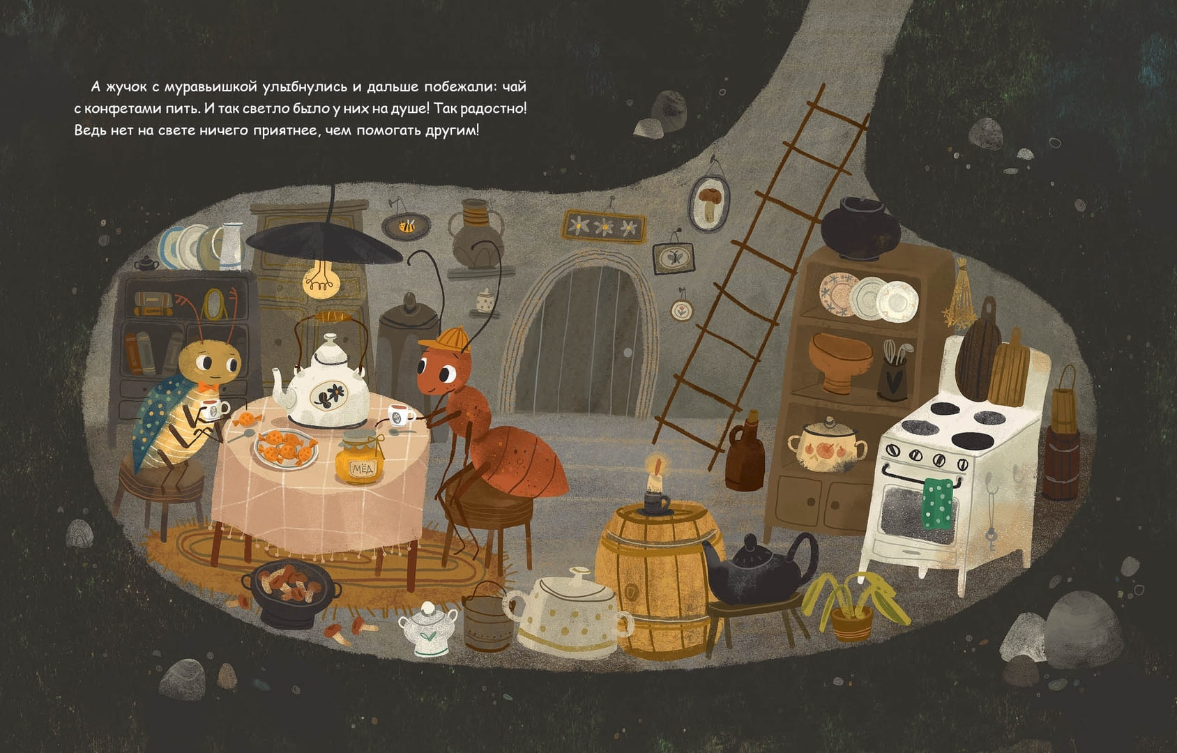 Иллюстрации Даримы Эрдынеевой дополняют текст и работают на ту же задачу — вовлечь и эмоционально окрасить происходящее. Жучок изображён трогательным и немного нелепым, муравьишка — энергичным и смышлёным. Картинки помогают ребенку не только следить за сюжетом, но и понимать эмоции героев.