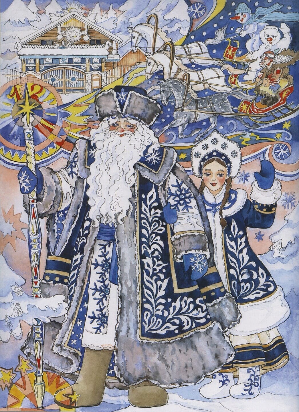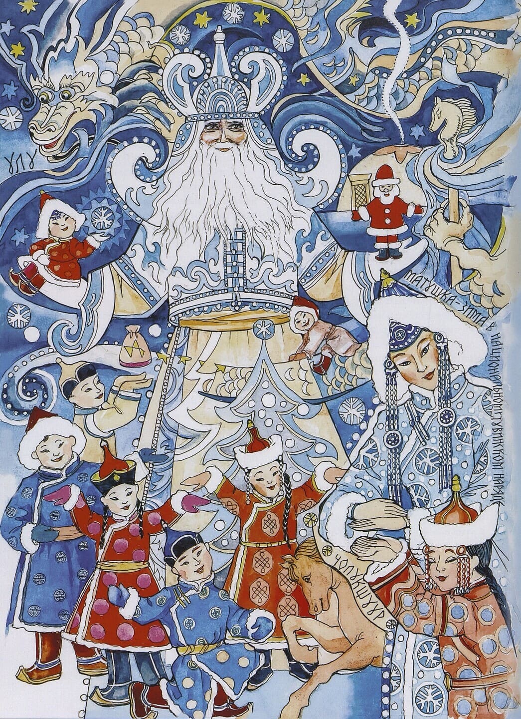 В дни зимнего солнцестояния предки современных жителей Башкирии собирались в зимние вечера вместе и гадали, почти так же, как в Святки русские крестьянки и барышни. У башкир тоже есть свой зимний волшебник – Суык Бабай. Похожий персонаж есть и у бурят: Сагаан Убгэн, Белый Старец. Он поздравляет и людей, и животных с Новым годом. В Великом Новгороде – Дед Трескун, похожий на лешего старичок в огромных валенках. В Ингушетии – Гор Дада, Зимний Дед. В Северной Осетии – Митын Дада. В Коми – Кэдзыд Пэль. В Татарстане – Кыш Бабай. В Якутии, на полюсе холода в Оймяконе, в пещере живёт Чысхаан – Властелин Мороза. В Карелии – три зимних волшебника: Талвиукко, Дед Халла и Паккайне. Самый «дедморозовский» – Талвиукко, у него есть своя резиденция в Пряжинском районе Карелии, куда можно написать письмо (адрес прилагается). А самый молодой – Паккайне, пришедший из олонецких преданий, его изображают в виде симпатичного безбородого парня.