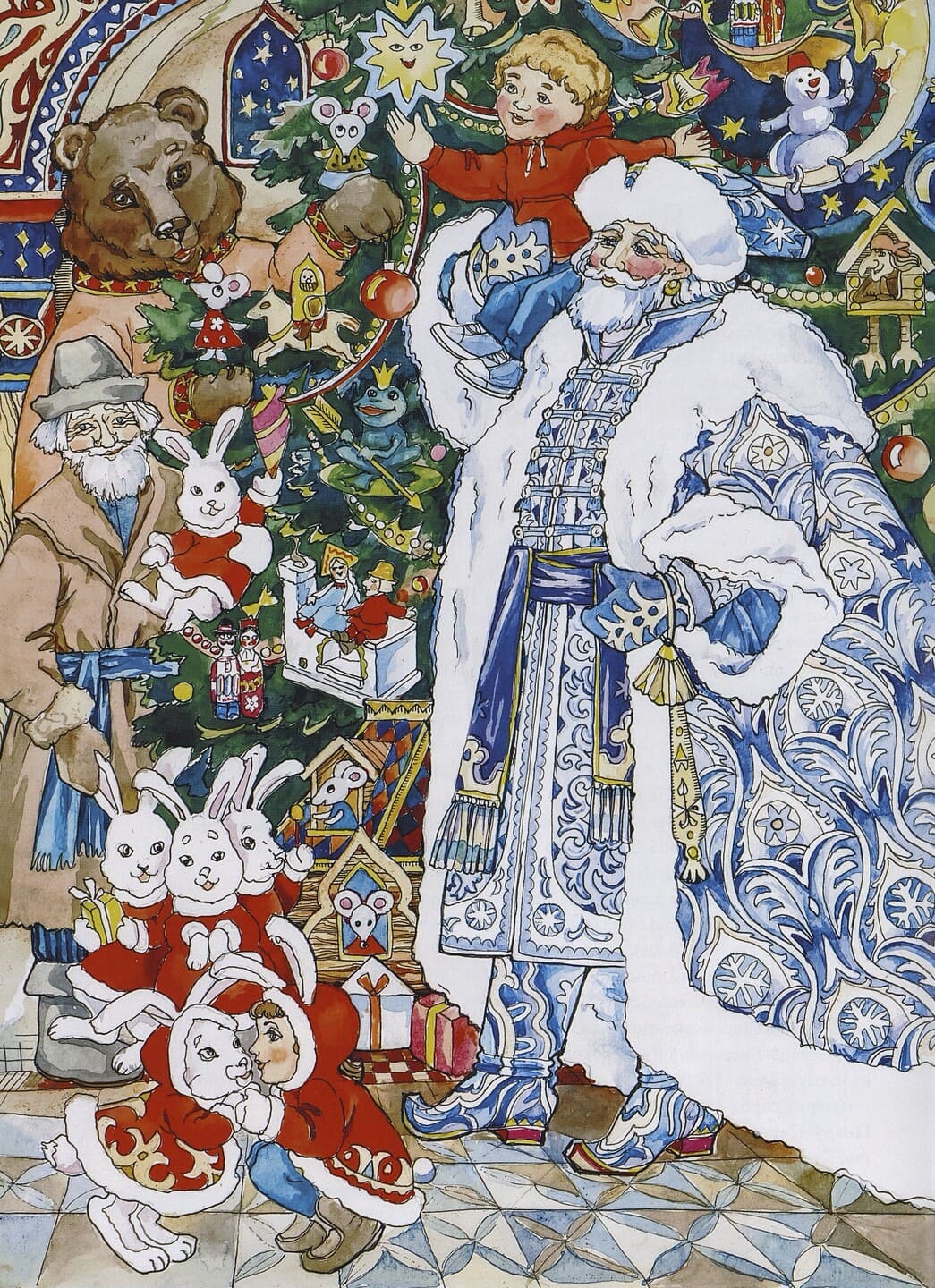 «Собиралась книга очень интересно, – говорит Ольга Колпакова. – Первая моя книжка про Новый год вышла 25 лет назад. Уже тогда я начала коллекционировать материалы про Дедов Морозов. Когда я преподавала в 116-й гимназии Екатеринбурга, мы с детьми придумали такого персонажа – Морозейка минус два, ростом с мороженку. Дети писали письма Деду Морозу, но тогда ещё у нас в России не было резиденции Деда Мороза, и дети присылали их мне на абонентский ящик. Эти письма у меня сохранились. Никто не просил подарки, но все хотели узнать что-то интересное про Деда Мороза, помимо классических народных сказок и тех историй, которые рассказывает на новогодних утренниках Дед Мороз. Это натолкнуло меня на мысль написать книжку про Новый год. За эти двадцать с лишним лет у меня накопилось много материала, я продолжаю отслеживать, где что новое появляется… Художнику Ольге Бельковой пришлось повозиться, чтобы изобразить костюм национального Деда Мороза. Она старалась подчеркнуть его колорит, отразить происхождение персонажа. Рисунки, где изображались традиции разных народов, зимние персонажи, – это такая мозаика, целая открытка, которую надо рассматривать и расшифровывать. Но там нет ни одного лишнего штриха, всё художником продумано до мелочей. Когда у нас уже были готовы тексты, мы отсылали их в резиденции Дедов Морозов, и их сотрудники очень помогли нам с поиском материала. Отсылали материалы и в министерства культуры тех регионов, о которых писали. У нас в книге 30 регионов и около четырёхсот иллюстраций. Мы благодарны всем, кто с нами постоянно был на связи, кто терпеливо правил текст. Библиотеки, музеи – мне даже сложно сказать, сколько было привлечено людей, чтобы получилась эта энциклопедия…».