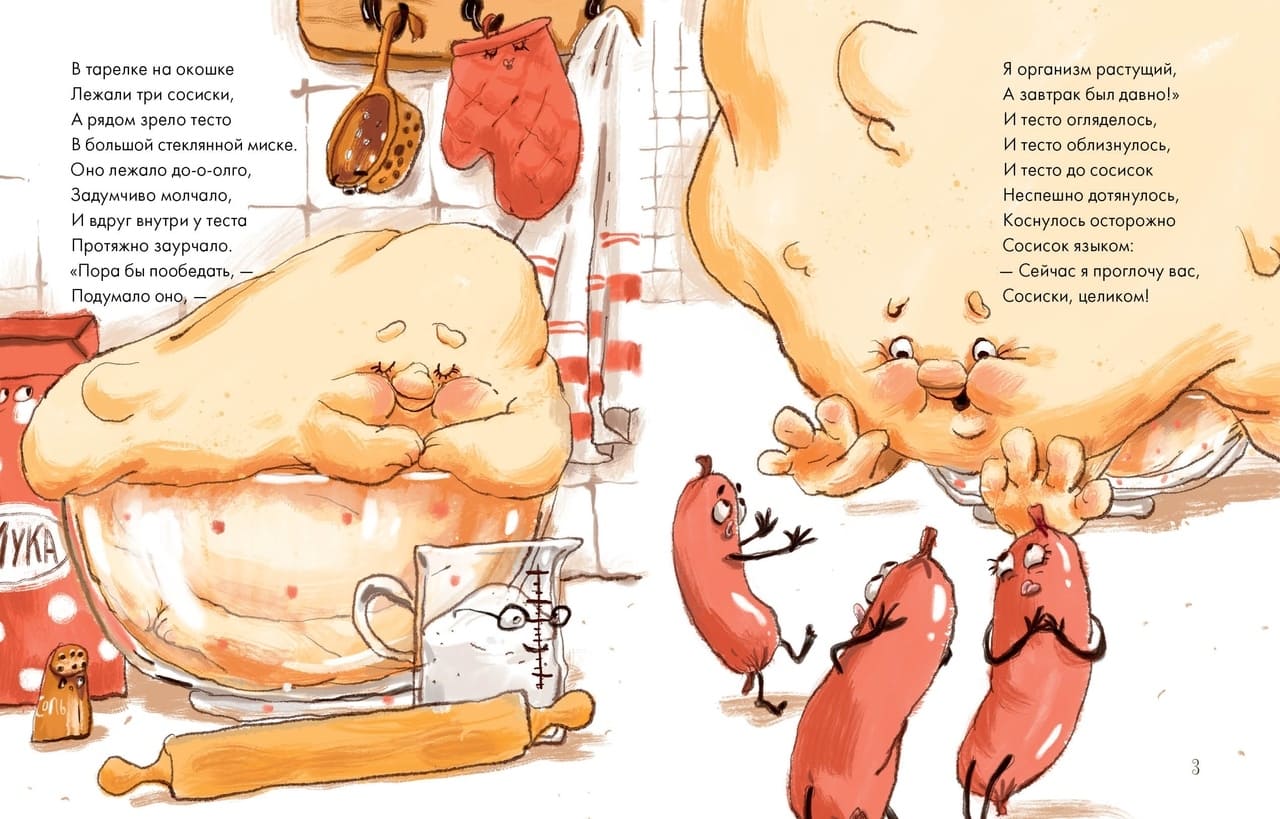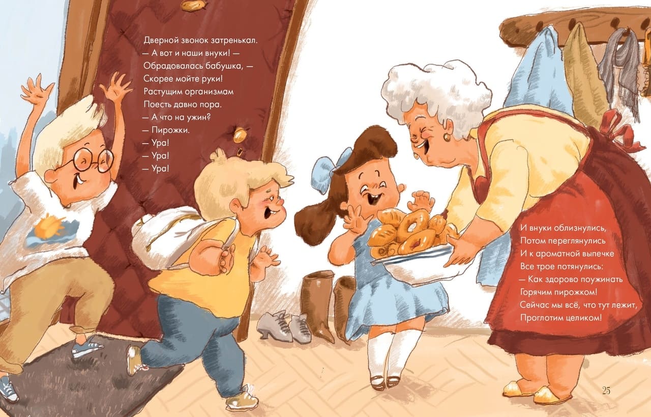 На кухне всё дышит теплом и ароматами, и среди этой аппетитной тишины в большой миске подходит тесто. Оно лежит там уже давно, растёт, набирается сил… и, кажется, слегка проголодалось. Вокруг – капуста, творог, сосиски, джем: все готово для будущих начинок. А бабушка неспешно раскладывает продукты, потому что знает: скоро придут в гости внуки, и тогда начнётся настоящее волшебство. Так в книге Татьяны Павленко обыденность превращается в маленькую сказку, а ожидание – в приключение.