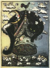 Евгения Лоцманова, проиллюстрировавшая «Сорочьи сказки» для издательства «Мир детства», определённо выбрала второе. На её «картинках» — красочный и изобильный мир, потешный, суетливый и благодушный. Иллюстрации плотные, насыщенные, они строятся как развёрнутая многоплановая сцена со множеством героев, с тщательно выписанными, продуманно расположенными деталями. Художница внимательно и вдохновенно работает с реалиями прошлого, так что иллюстрации исполняют ещё и роль энциклопедии: поясняют, как выглядят вальки или ухват. Искусно схватывая, обрисовывая сюжеты Толстого, Лоцманова овеществляет их, делает осязаемыми, почти ничего не оставляя от подпущенного писателем морока. И чтобы морок невзначай не пробился, иллюстрации ни на секунду не предоставляют текст самому себе. Страницы забраны в разноцветный орнамент, на виньетках помещаются цветочные узоры, на поля вынесены сюжетные сценки или упомянутые в сказках животные и предметы. На каждой странице глазу есть за что зацепиться, есть что «потрогать». Чтобы убедиться — это просто сказка, тёплая и знакомая как дерево.