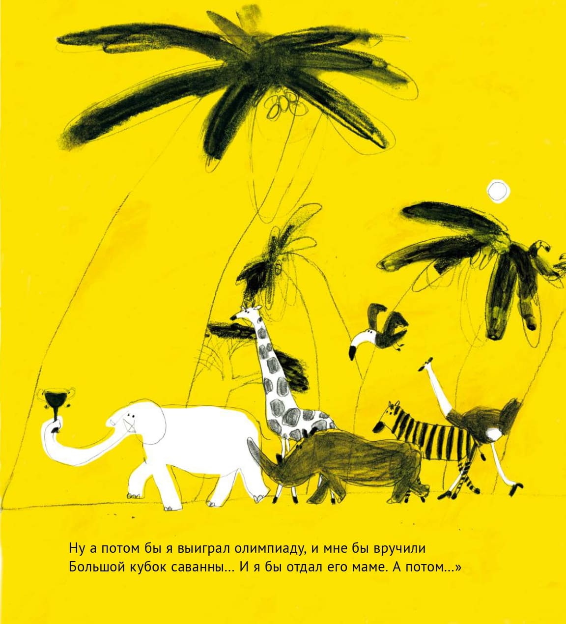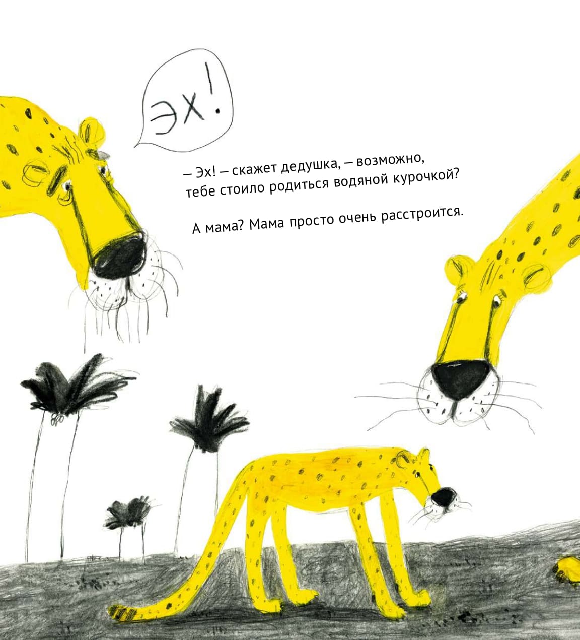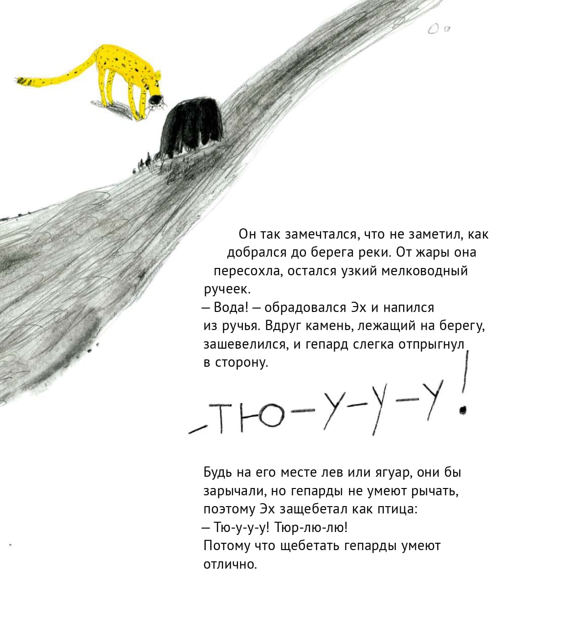 Отчасти эта сказка напоминает «Слонёнка» Редьярда Киплинга: Африка, экзотические животные, аллегорический подтекст и герой, который сильно отличается от остальных. У маленького гепарда Эдмунда не получается бегать, и он переживает, что не соответствует званию самого быстрого зверя. Но признать себя слабым – значит уйти от необходимости что-то менять. Так перед нами разворачивается психологическая история о страхе, сковывающем в буквальном смысле. Что оказывается лекарством? Обстоятельства, которые позволяют забыть о беге как о сложной обязанности. Эдмунд незаметно научился всему, что прежде казалось ужасно трудным. Подчёркивают подобный психологизм иллюстрации Елены Репетур. Цветной главный герой на фоне чёрно-белой, словно отчуждённой от него саванны, будто бы ненамеренные, но точные штрихи – всё создаёт лирическую атмосферу. Неслучайно «Эх!» победил на международном фестивале книжной иллюстрации МОРС 2021.