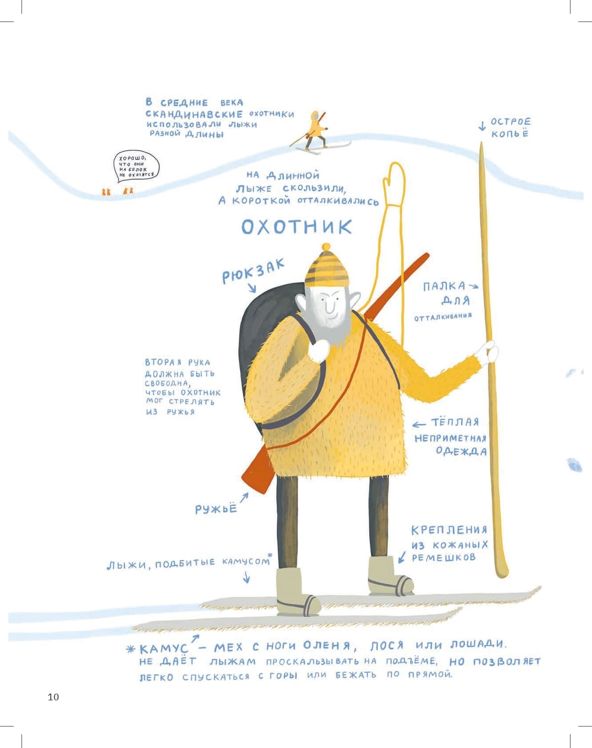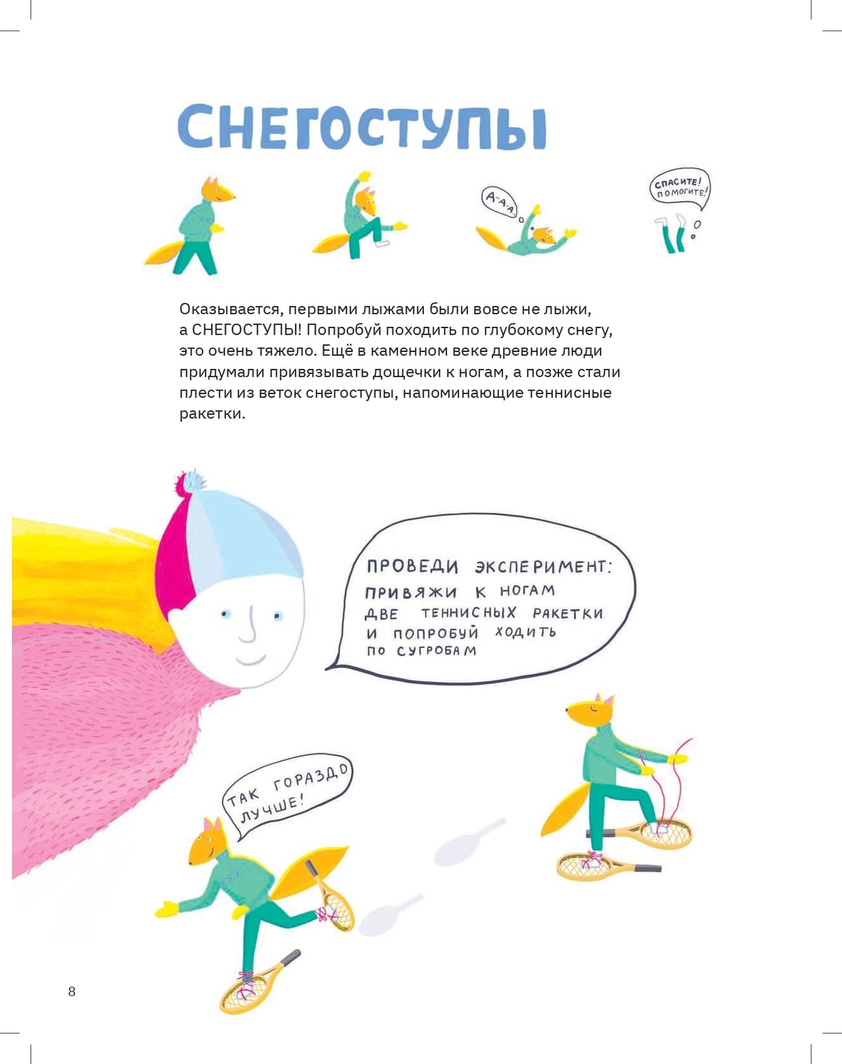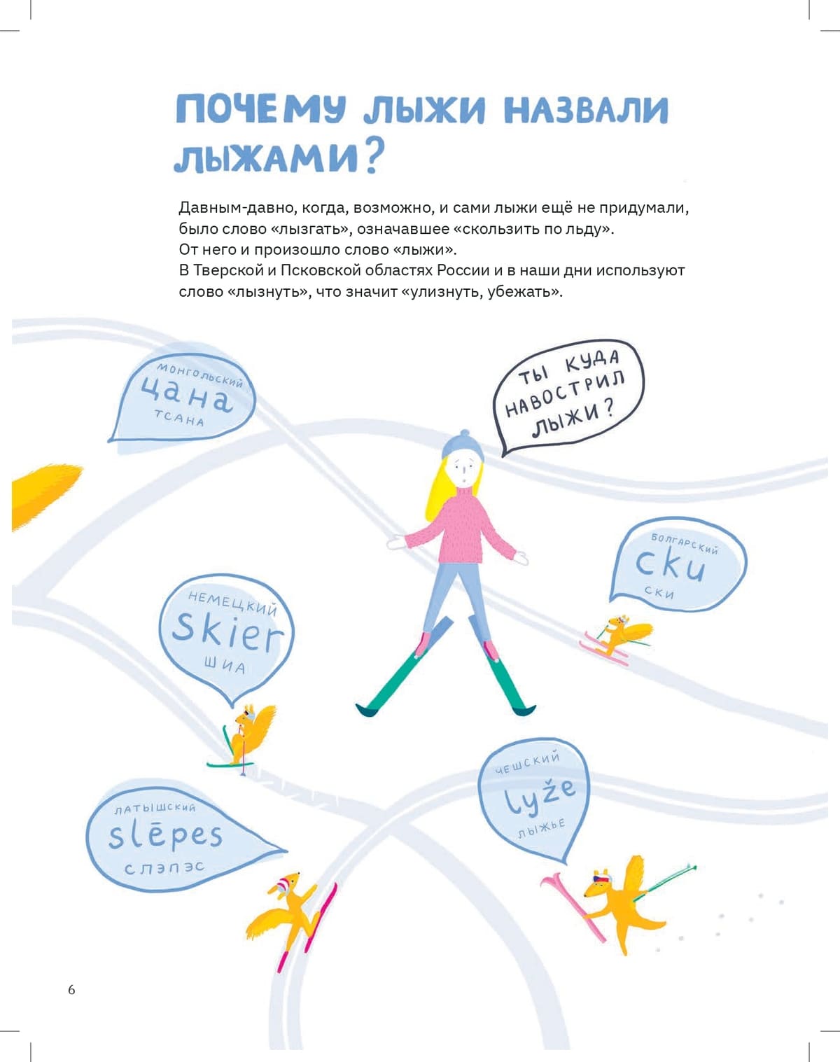 Кто-то сочтёт это странным, но не все люди любят лето. Знойным июлем некоторые начинают скучать по снегу и бодрящему морозу. Особенно часто тоскуют лыжники и сноубордисты, для которых книга Марии Павликовой может стать отдушиной. Здесь нетрудно проследить всю историю лыж, от первых охотничьих снегоступов до современных моделей с «рокером» и «камбером». Пойдёт речь и о снегоходах, и о трамплинах, и о катании по пескам, и о некоторых вполне летних активностях. Для начинающего лыжника или просто любопытного читателя-школьника эта книга открывает многообразие и романтику не самого популярного сегодня вида спорта. Кроме того, в путеводителе есть забавные практические задания – например, смастерить маленького лыжника с помощью пластилина и палочек от мороженого.