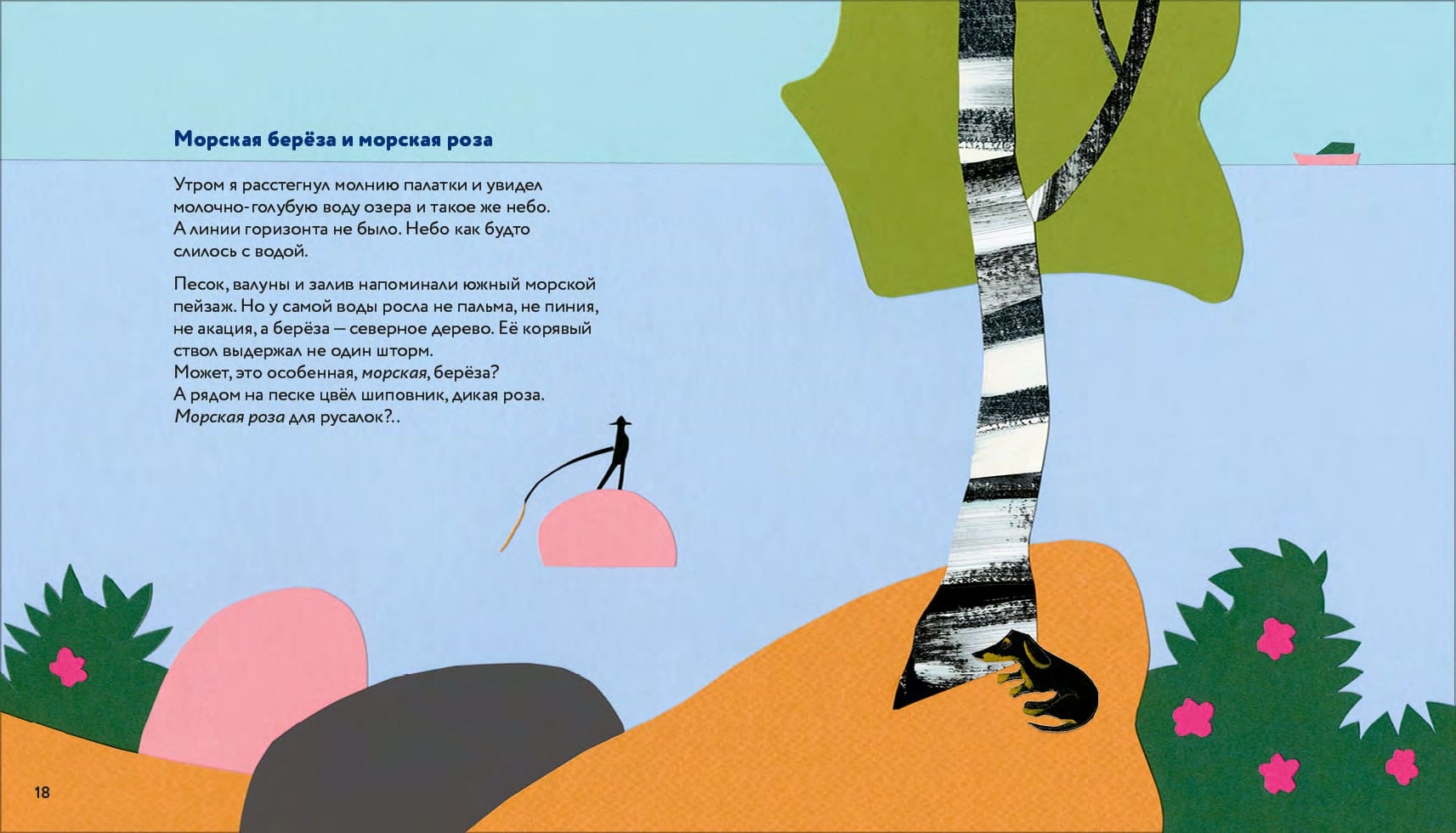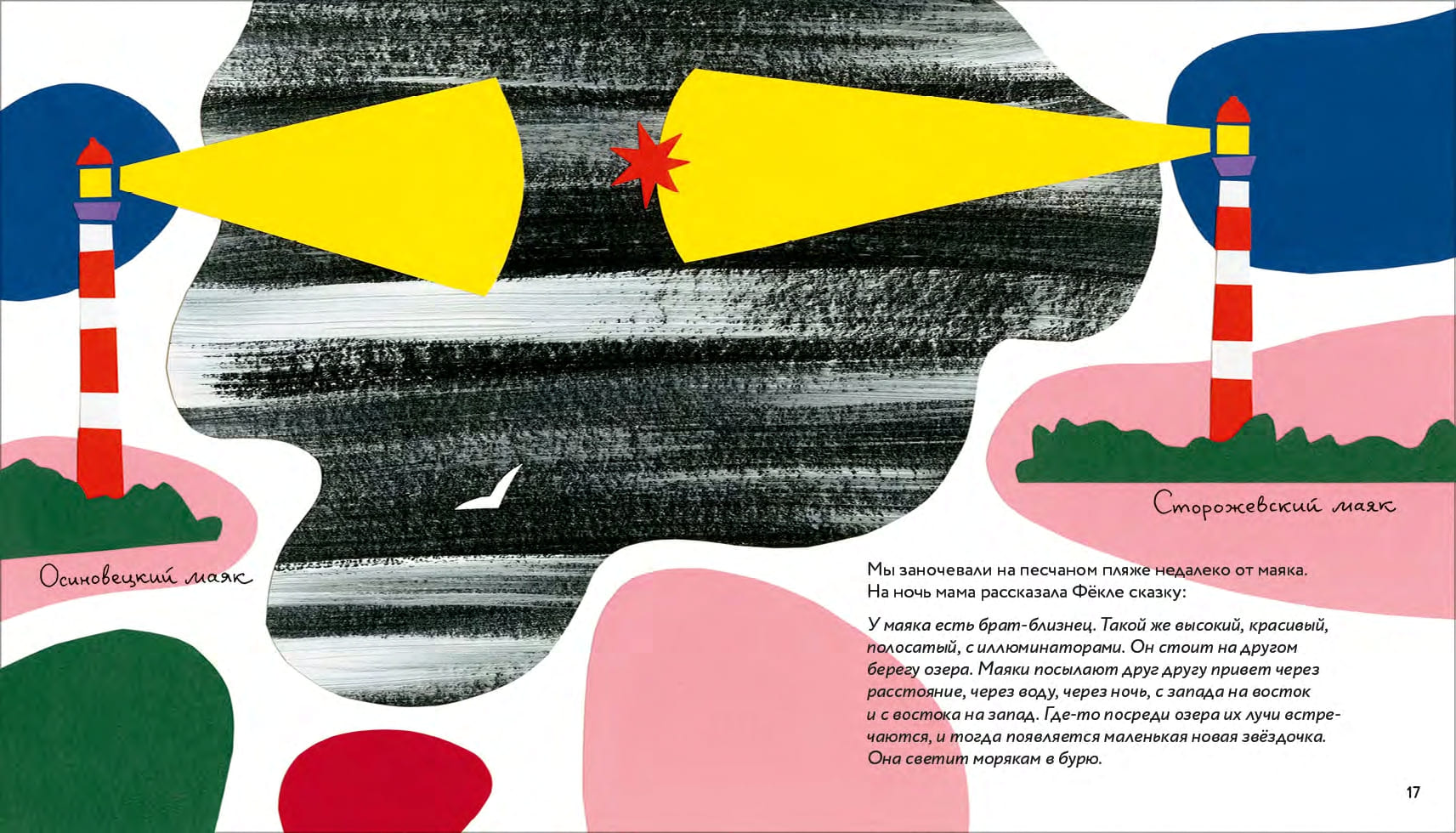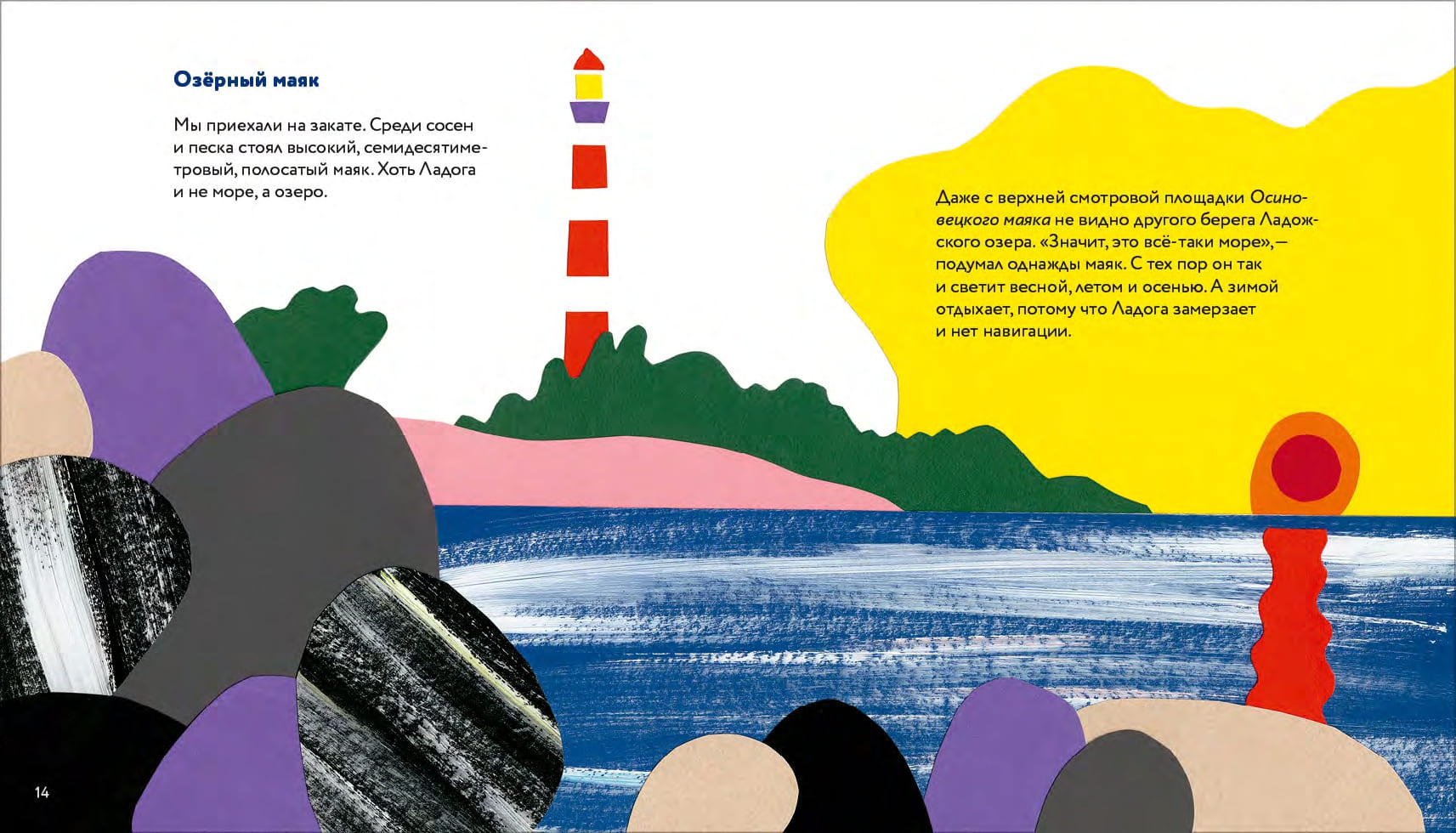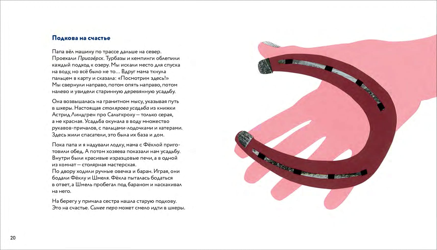 Уже по дороге к Ладоге путешествие становится для Феди особенным. По ночам вокруг палатки стрекочут кузнечики, собака встречает стадо коров, а Осиновецкий маяк оказывается почти таким же высоким, как морской, ведь противоположный берег далеко, как и на море. Сам вояж на «Синем пере» выглядит для Феди маленькой познавательной одиссеей. Что такое шхеры, какие скалы называют северными слонами и чем банкомёт отличается от банкомата? Федя видит нерп, ловит руками окунька, слышит от мамы отрывки из Калевалы и узнаёт о старинной усадьбе. А главное, теперь он навсегда сохранит память и об удивительных местах, которые он посетил вместе с родителями и сестрой, и о необычном обаянии странствий с палаткой и лодкой.