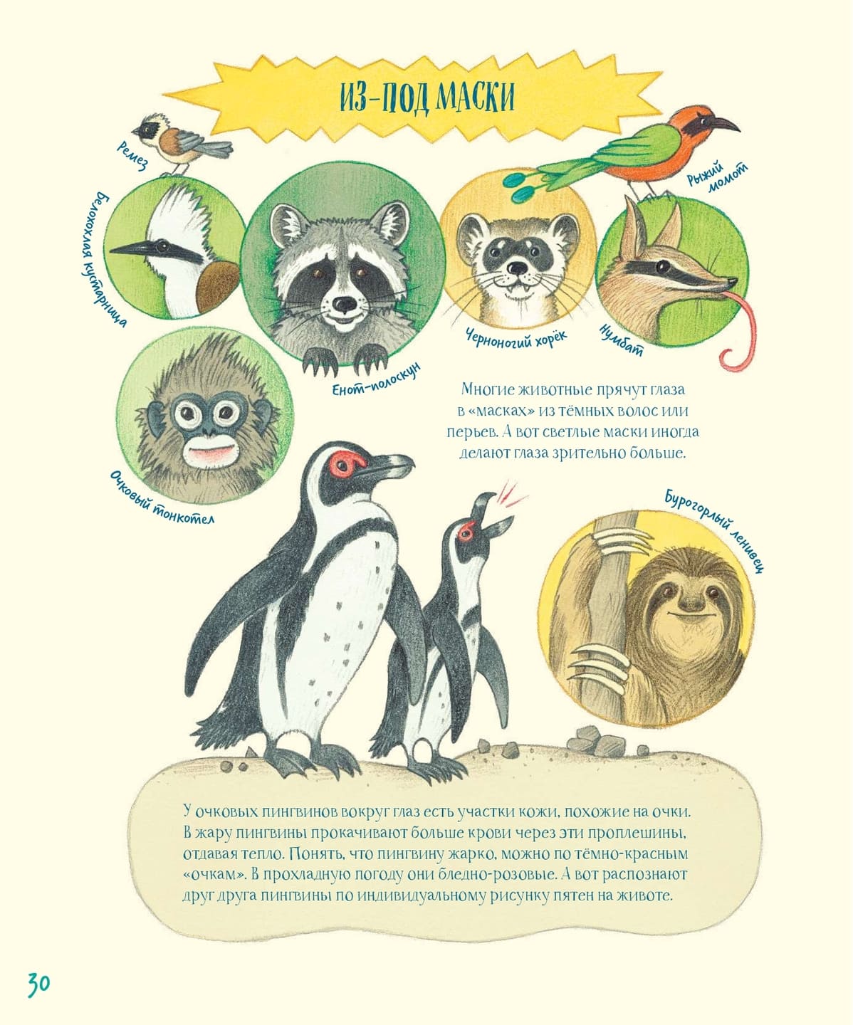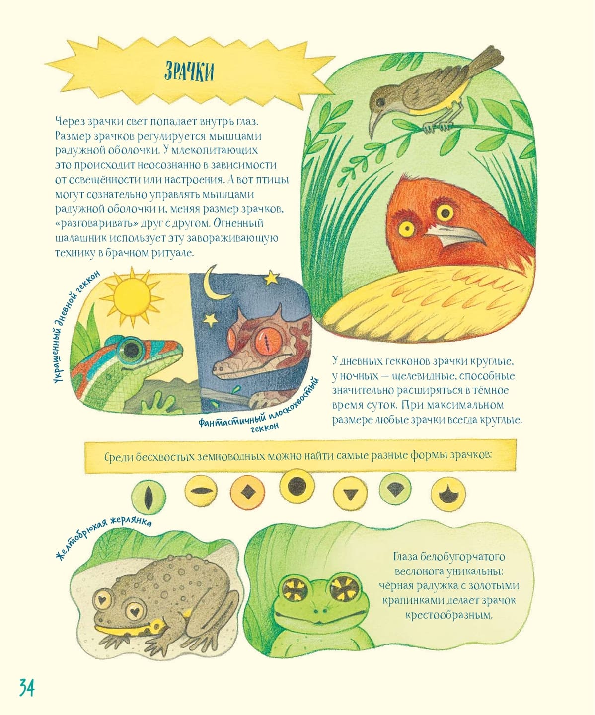 Продолжение серии «Собрание причудливых животных», где экскурс в зоологию раскрывается в ракурсе устройства какого-то одного органа у разных видов, «Гениальные глаза» радуют не только лаконичной информативностью, но и забавными, порой даже шутливыми иллюстрациями. Зрачки желтобрюхой жерлянки в форме сердечек, растерянная рыба-меч и самодовольная панда – очеловеченная мимика самых разнообразных существ добавляет книге немало обаяния. Первые страницы повествуют о большеглазых: например, об осьминогах, долгопятах и совах. Затем темы становятся уже менее очевидными. Так, под «красноречивыми» глазами подразумеваются те, которые в значительной степени используются животными для общения, а один из разворотов посвящён диковинным глазам-устрашителям. Кроме того, в конце есть словарик специальных терминов, и в результате перед нами оказывается достаточно насыщенный содержательно, ясный и не лишённый остроумия офтальмологический путеводитель по миру рыб, зверей, птиц, моллюсков, земноводных и насекомых.