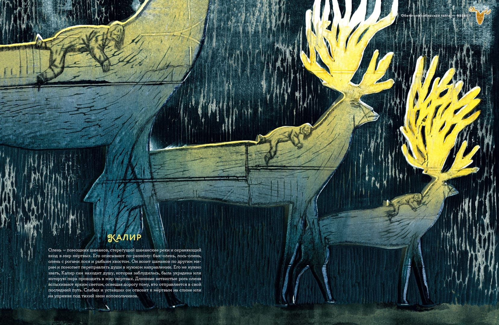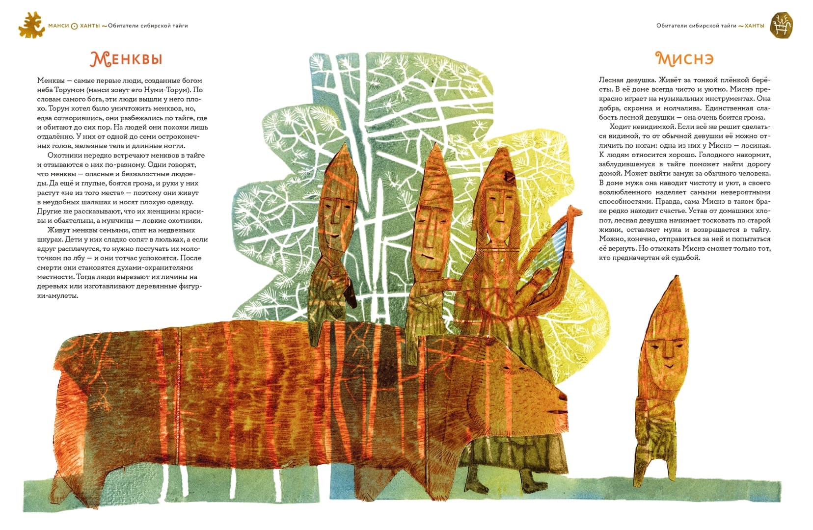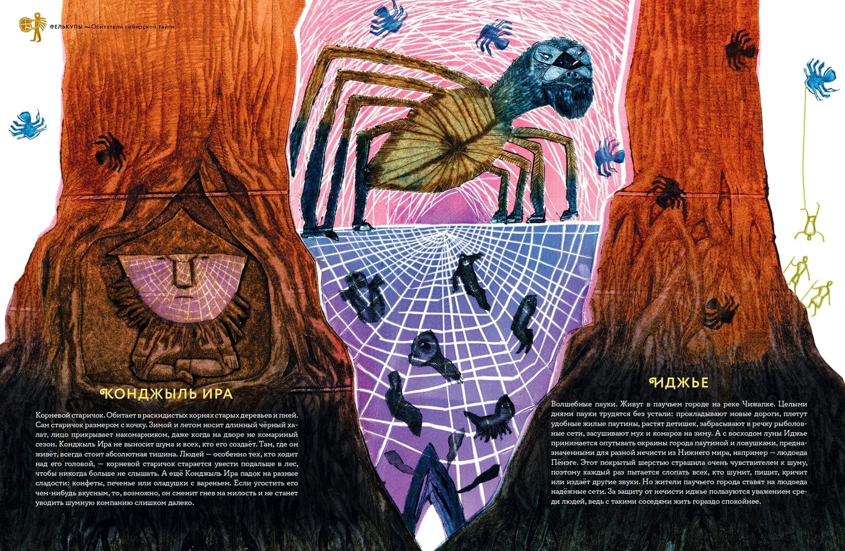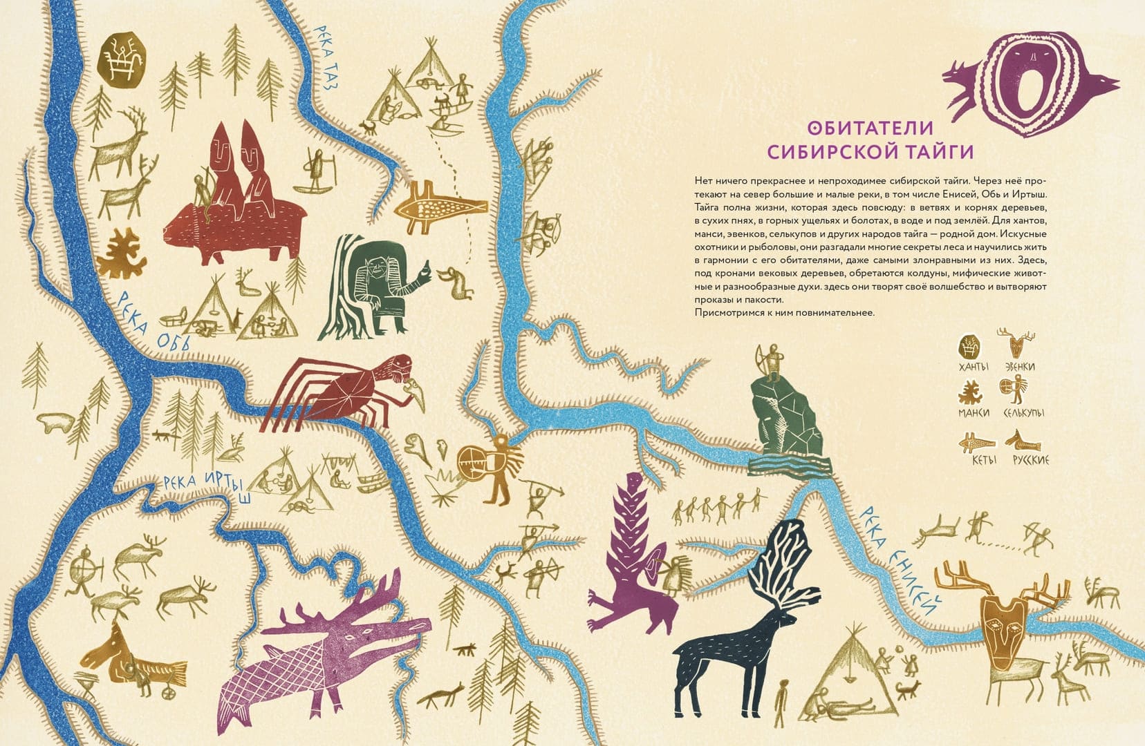 «Обитатели Сибири. Вымышленные и настоящие» – густонаселённая галерея фольклорных персонажей, собранная писательницей и преподавателем Мариной Бабанской и проиллюстрированная художницей Катериной Дубовик. Здесь селькупские лесные пауки-иджье охраняют мир людей от злых духов, а бурятские привидения-бохолдои порой помогают родителям воспитывать непослушных детей. Остров Сахалин оказывается живым существом, которое надо беречь, чтобы оно, согласно поверьям нивхов, не «ворочалось» и тем самым не вызывало землетрясений. Иногда речь идёт просто о забавных казусах, например, существо по имени бабр – полутигр-полубобр – появилось из-за ошибки при составлении герба Иркутска во времена Российской империи, а история таинственного существа из якутского озера Лабынкыр приближается скорее к формату современной городской байки. Живущая в центре Земли всеведущая лиса, белоглазый народ сихиртя, железнокрылая птица и помогающий шаманам олень – книга впечатляет многообразием сюжетов, характеров, описаний, их детальностью. Экспрессивные, немного авангардные иллюстрации Катерины Дубовик это только подчёркивают. А главное, читая страницу за страницей, легко почувствовать, насколько ярким может быть воображение человека, и как сила нашего воображения способна создавать пространство подлинного волшебства.