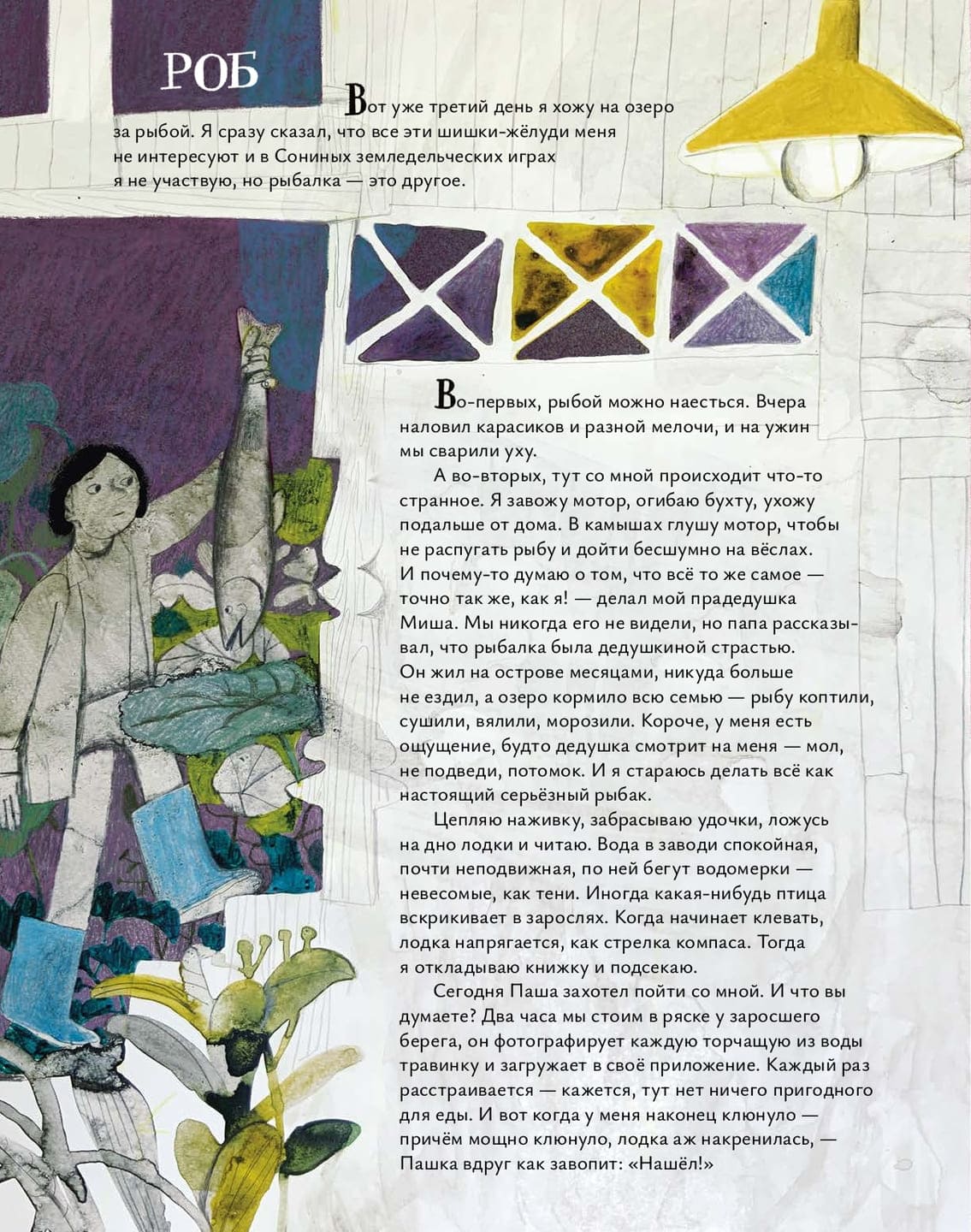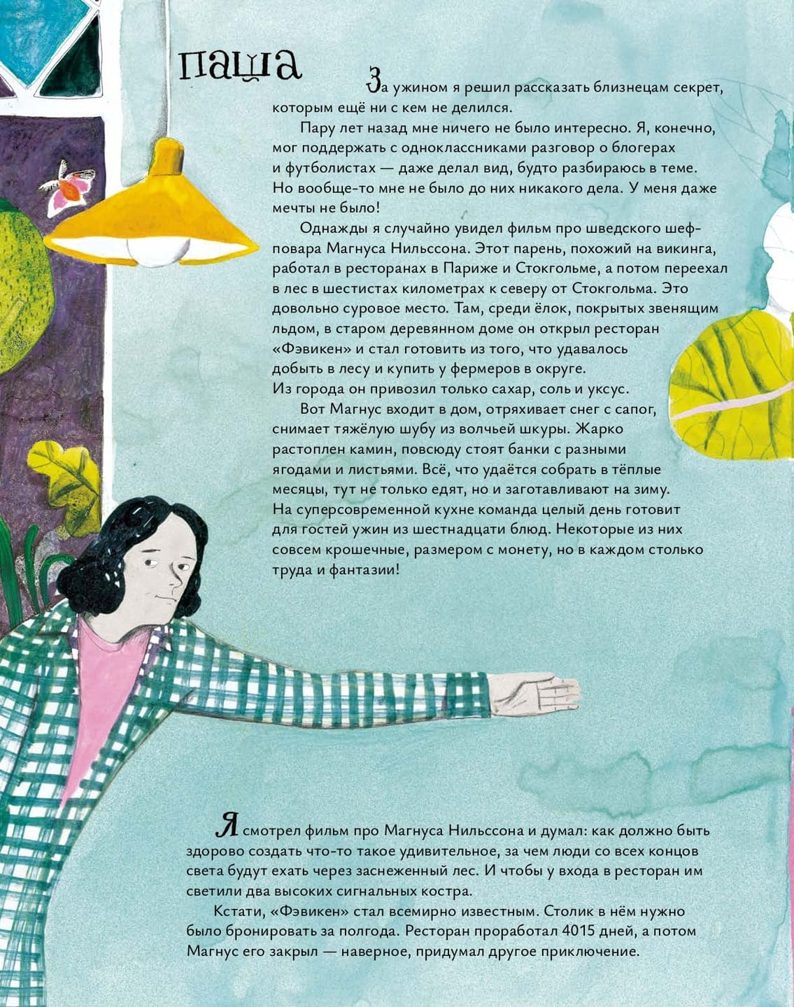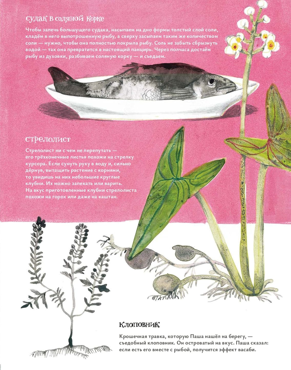Завязка этой книги звучит как начало подростковой робинзонады: дом на озёрном острове, вокруг лес, взрослых нет. Кажется, здесь должен кто-то потеряться или, наоборот, вот-вот отыщется что-то жуткое и загадочное. Однако жанр повести другой, можно даже сказать, что производственный. Главный герой Паша берёт с собой в рюкзаке книгу о съедобных дикоросах, кулинарную утварь и огромный запас терпения и вдохновения. Он в первый же день убеждает младших брата и сестру, близнецов Роба и Соню, помочь ему собрать грибы и коренья, а затем делает необычный и вкусный ужин. Вскоре каждый находит занятие по душе. Роб увлекается рыбалкой, Соня заботится об огороде. Чуть позже герои едут в монастырь, чтобы купить там яйца и молочные продукты. В домик на озере действительно начинают заглядывать люди. Они угощаются и дают взамен что-нибудь полезное.