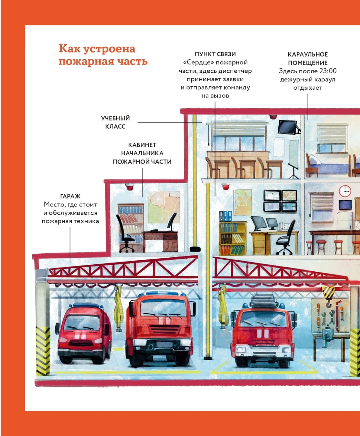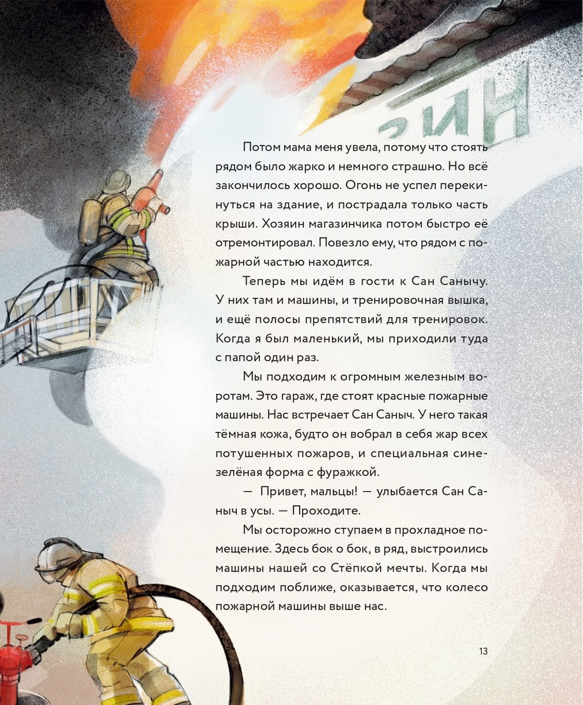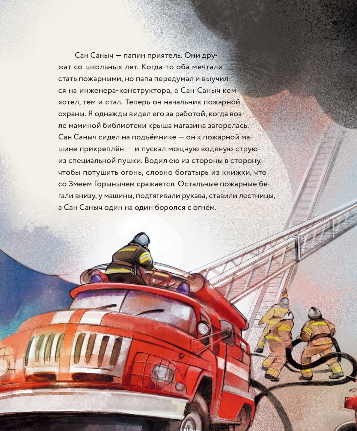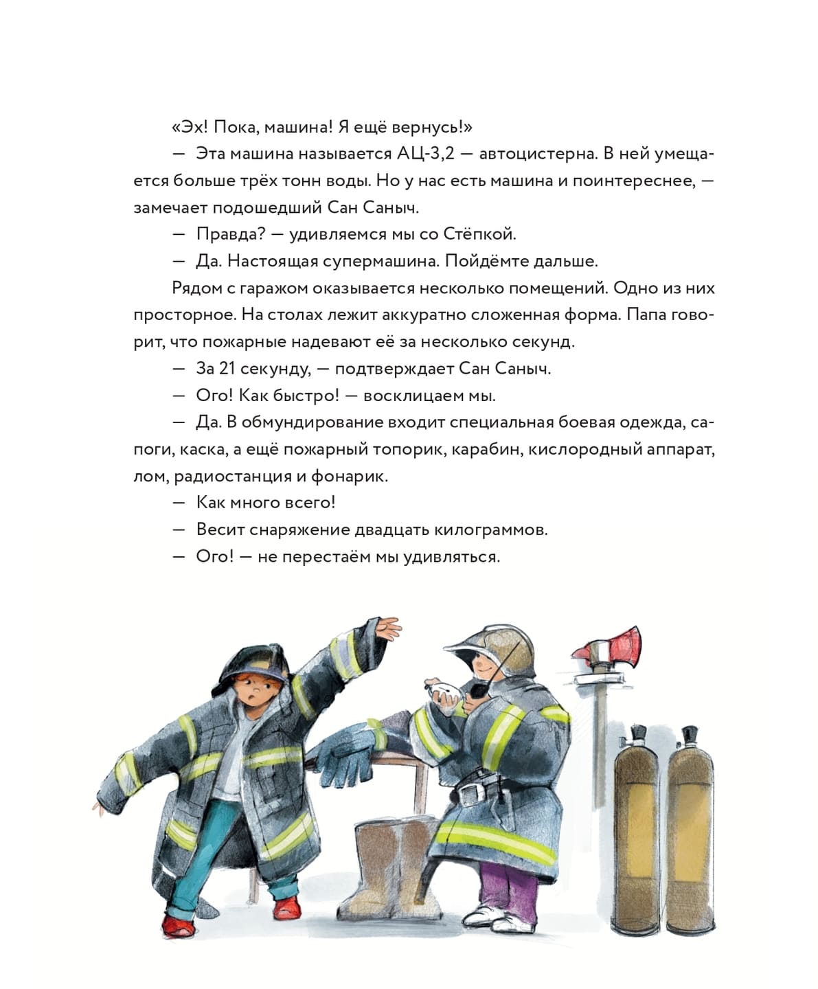 В книге Ольги Орловой забавная история двух друзей соседствует с познавательным экскурсом в профессию. Здесь можно найти подробные описания снаряжения пожарных, узнать об устройстве их служебных машин, схему типичной пожарной части. Читателям расскажут о правилах, например, о важном и строгом предписании надевать форму за двадцать одну секунду, а ближе к финалу появится краткая историческая справка о спасателях прошлого. В то же время перед нами книга с полноценным сюжетом – рассказ о мальчиках Яше и Стёпе, которые обретают профессию мечты. Благодаря Яшиному папе они вовремя понимают, насколько сильно реальная работа пожарного, где нужно методично тренироваться, отличается от игрового или киношного образа огнеборцев. Кроме того, заметную роль в книге играет тема династических профессий и внутренней преемственности поколений – уже после экскурсии Яша узнаёт от папы, что его прадед был пожарным в блокадном Ленинграде, когда эта работа, и без того всегда требующая недюжинной смелости, означала особый риск и подлинный героизм.
